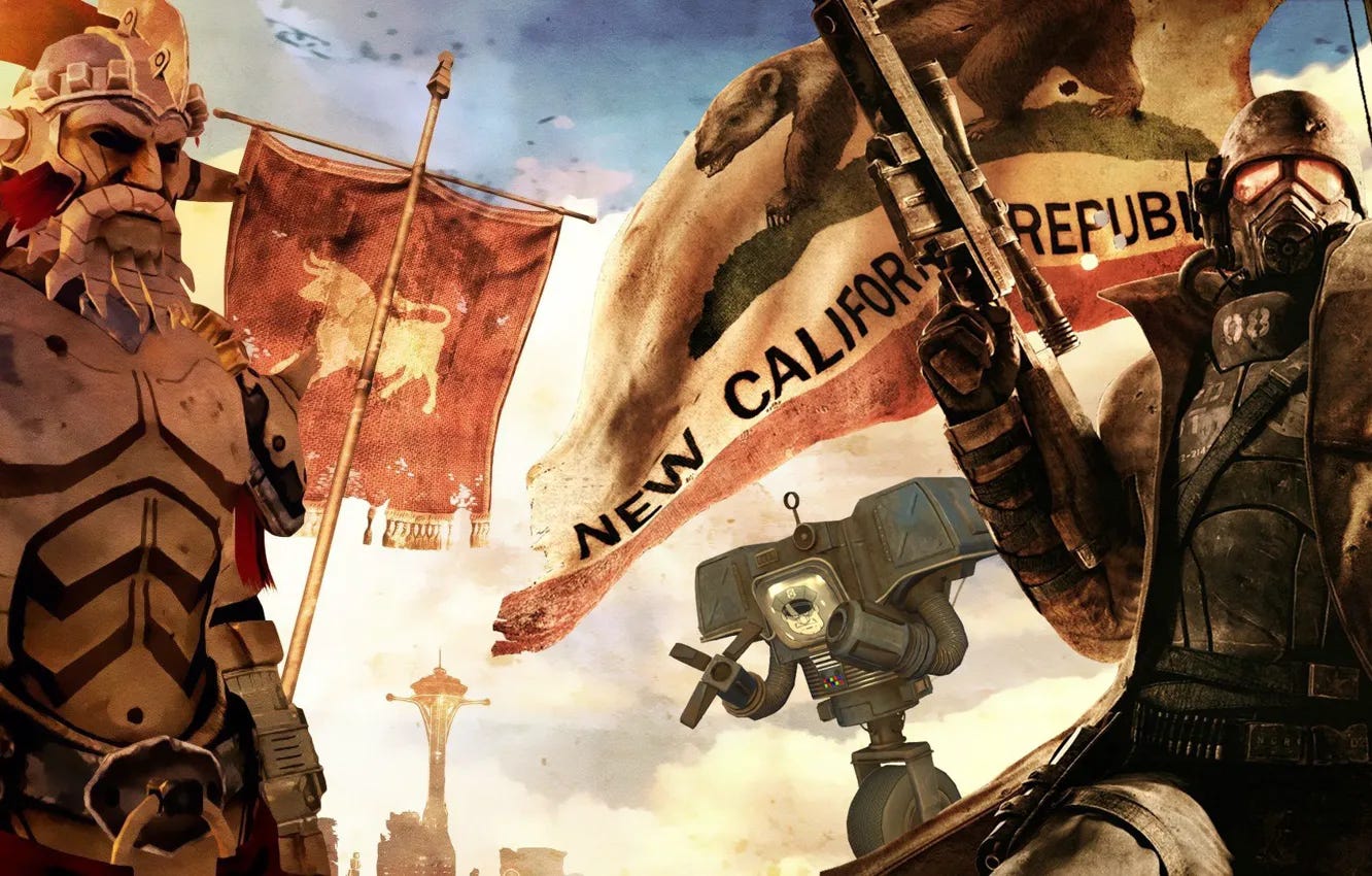 Old World Blues is not merely about longing for a lost era. It is about the psychological and ideological paralysis that results from refusing to let go of what once was. In the game, nearly every major faction is a reflection or more fitting a distortion of a pre-war ideal. Mr. House, the reclusive and godlike CEO of RobCo and ruler of New Vegas, is a technological immortal being who has literally preserved himself from the pre-war era in cryogenic stasis. His vision for the future is one where the pre-war technocratic capitalistic world is restored under his singular direction. The New California Republic or NCR, with its bureaucracy, elections, and patriotic iconography, tries to resurrect the liberal democratic order of the United States or the ideal of the American democratic mythology, complete with corruption, expansionism, and inefficiency. Caesar’s Legion, the most overt pastiche of historical resurrection, reimagines ancient Rome through the lens of brutality, discipline, and slavery—an attempt to escape the decadence of the old world by reverting to an even older, supposedly purer form. Even the Brotherhood of Steel is a kind of religious order preserving the relics of technology, much like medieval monks who preserved knowledge through the Dark Ages and the Catholic Knightly orders of the Crusades. In this thematic landscape, the Mojave Desert becomes more than just a war-torn frontier; it becomes a liminal space where ideological ghosts fight over the corpse of America. Fallout: New Vegas forces the player to engage with these remnants not just as narrative flavor, but as pivotal choices. The game’s brilliance lies in how it compels the player to reckon with each faction’s interpretation of what must be salvaged, what must be discarded, and what future should be built. Mr. House believes in a meritocratic technocracy, ruled by the enlightened few. The NCR represents democratic imperialism, spreading its values regardless of whether they are appropriate to the land it seeks to control. Caesar’s Legion claims to offer unity and order at the cost of freedom and humanity.